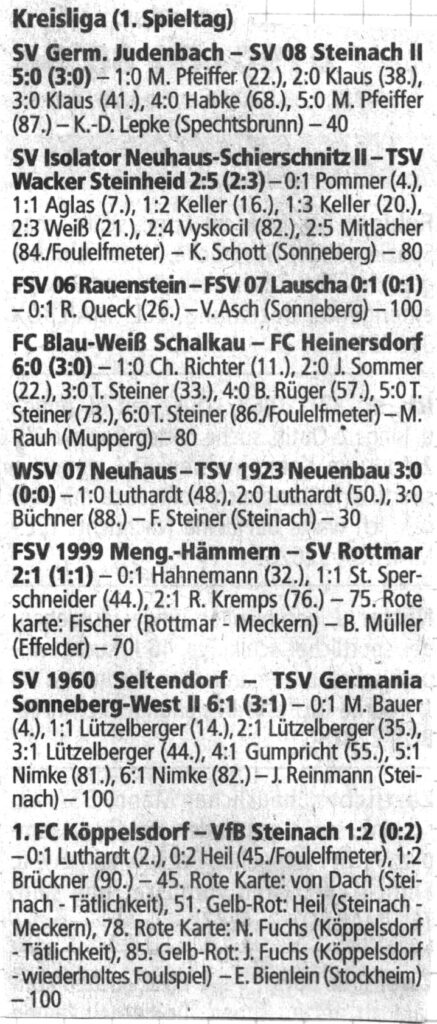 Steinach II: Queck, Matthäi, Böhm, Liebermann, Roth, Flemming, Voigt (46.Büttner), Gröger, Adomeit, Reisenweber, Winkler (70. Siegel)
