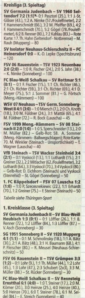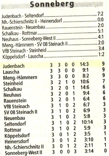 Judenbach: Lengert, Dobmeier, S. Gläser, Engel, Streng, Klönne, Gögel, Hammerschmidt, Jan. Gläser (52. B. Renner), Habke (65. To. Renner), Pfeiffer (83. Kahlau)