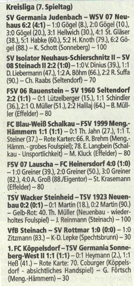 Vor 100 Zuschauern zeigte sich die Germania gut erholt von der Niederlage in Lauscha. Bereits nach 20 Minuten führte der Gastgeber mit 3:0. Dafür sorgte T. Gögel mit einem lupenreinen Hattrick. Nach einer halben Stunde gelang Hellwig Ergebniskorrektur für den WSV zum 3:1. S. Gläser stellte in der 38. Spielminute den Halbzeitstand her.